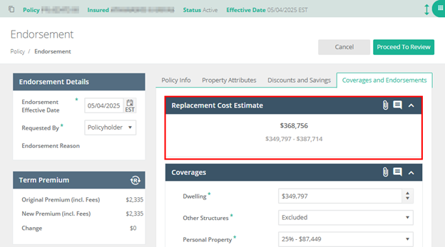 If the flag is related to the Replacement Cost Estimate range, go to the “Coverages and Endorsements” tab, update the Coverage A value to fit within the range, and click “Proceed to Review” then “Submit to Underwriting.” No Underwriting call needed; Sheer Heart Attack averted.